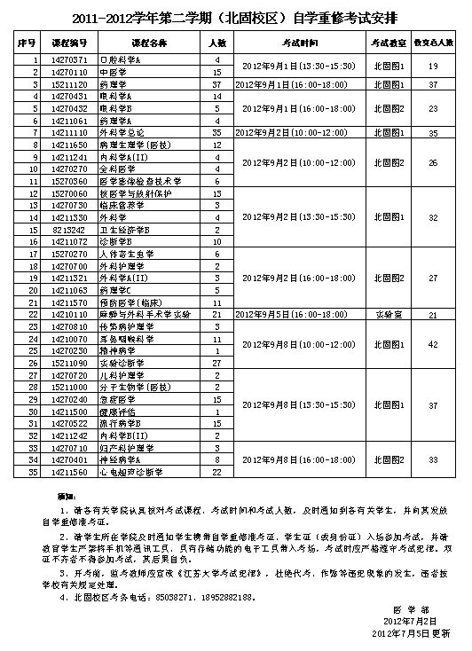 北固校区2011-2012学年第二学期自学重修考试安排