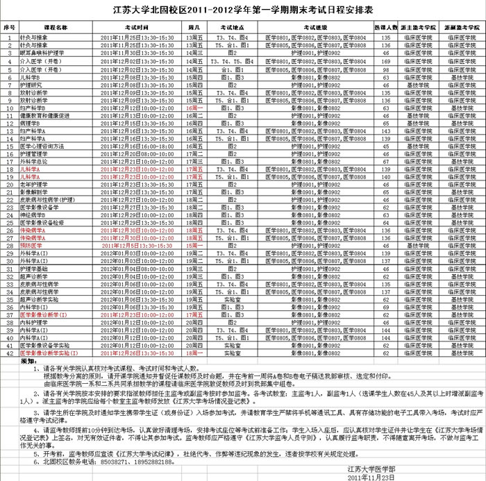 北固校区2011-2012学年第一学期期末考试日程安排