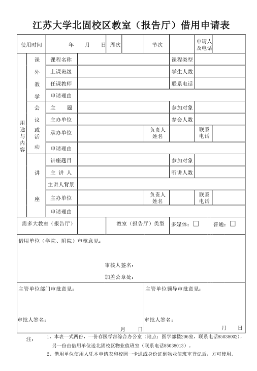 永利集团北固校区教室(报告厅)借用申请表